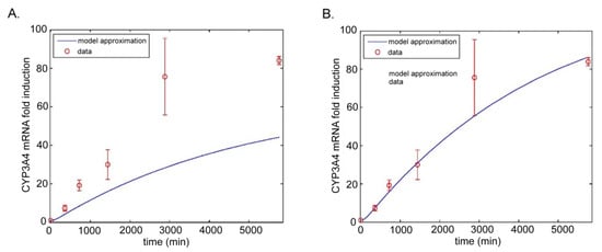 We remark that PXR levels exhibit a large inter-donor variability caused by, among other things, differing PXR gene (NR1I2) genotypes, mutations, or variants. We demonstrate the importance of this issue in the validation of the model of Luke et al. with our own experimental data. In the experiment, primary human hepatocytes were treated with 10 µM of rifampicin. The expression level profiles of mRNA for the CYP3A4 enzyme were analyzed using the qRT-PCR method at 0, 6, 12, 24, 48, and 96 h from the beginning of the treatment. The measured average fold levels are displayed as circles in Figure 3 and the blue curves give the levels predicted by the model of Luke et al. [90]. In the left part of the figure (Figure 3A.), we used both the literature parameter values and the estimated parameter values reported by Luke et al. Clearly, our experimental data do not fit well with the predicted estimation. However, one of the estimated parameters is the total amount of PXR in the cell. Doubling the value of this estimated parameter resulted in satisfactory fitting as can be seen in the right part of the figure (Figure 3B.). This example clearly indicates that the mechanistic molecular-based model can be parametrized with individual parameters based on PXR gene (NR1I2) genotype or particular PXR expression.