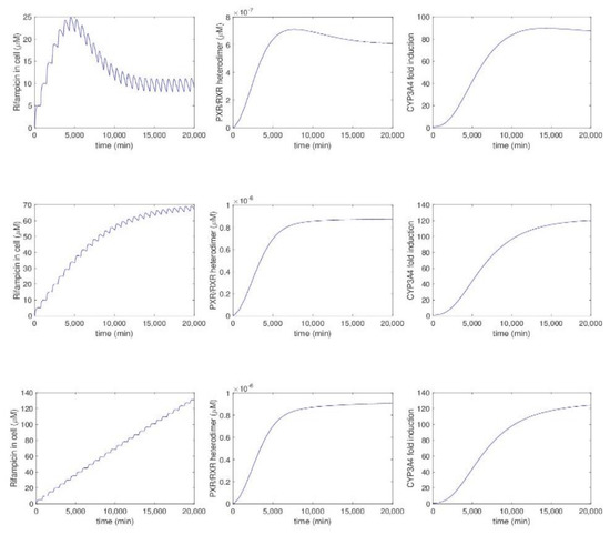 According to our knowledge, temporal data concerning the downregulation of PXR was not considered or used in any model. Baily et al. first proposed that PXR negative feedback downregulation of PXR expression attenuates the expression of the CYP3A gene as was shown using in silico modelling and a data set with only 48 h time-endpoint measurements.