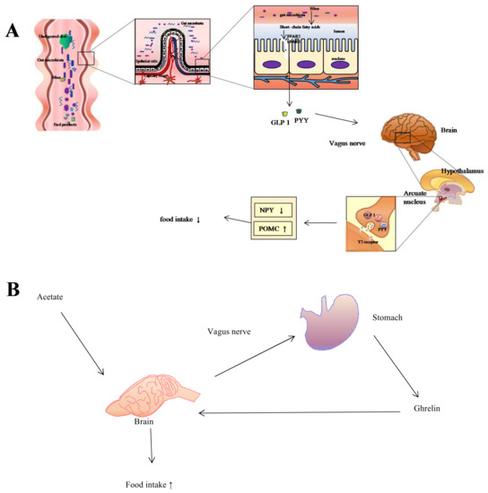 Regulation of food intake via gut-brain pathway. (A) When undigested dietary residue arrives at the caecum, colon, rumen, and hind gut, the bacteria populated in the intestines ferment them to short-chain fatty acids (SCFAs) (e.g., acetate, propionate, and butyrate). Then free fatty acid receptor 2 (FFAR2) and free fatty acid receptor 3 (FFAR3) on the L-cells interact with SCFAs to trigger the secretion of anorectic hormones, including peptide YY (PYY) and glucagon-like peptide 1 (GLP1). PYY and GLP1 then preferentially bind to the Y2 receptor located on the arcuate nucleus of the hypothalamus via the vagus nerve, which further increases the expression of the anorexigenic pro-opiomelanocortin (POMC) neuropeptide while decreasing the expression of neuropeptide Y (NPY), thus managing to control food intake; (B) Microbiota ferment dietary nutrients, digesting them to SCFAs. Acetate molecules then stimulate the vagus nerve, which triggers the stomach to secrete the “hunger hormone” ghrelin, leading to the increase of food intake.