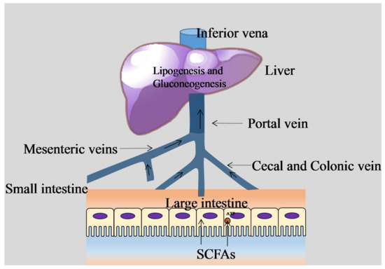 SCFAs in liver circulation and central metabolism. Butyrate, propionate, and acetate enter the liver via the portal vein after passing through the mesenteric veins, cecal veins, and colonic veins. They are then utilized for lipogenesis and gluconeogenesis in the liver, the products of which then enter blood circulation. SCFAs are an important source of energy (in the form of ATP) for colonocytes and for gluconeogenesis in the modulation of the central metabolism.