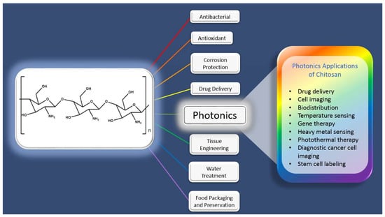 Schematic illustration showing different applications of chitosan (CS), highlighting the photonic applications of CS and its derivatives.