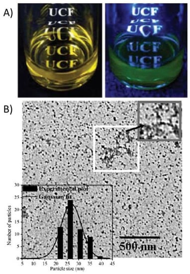 Demonstrates formation of FCSNPS using FITC. Daylight and emission pictures are shown in (A), and actual size and size distribution of the FCSNPs are shown in (B). Reprinted with permission from Chem. Comm. 2009, 2347–2349, Copyright 2009, Royal Society of Chemistry [].