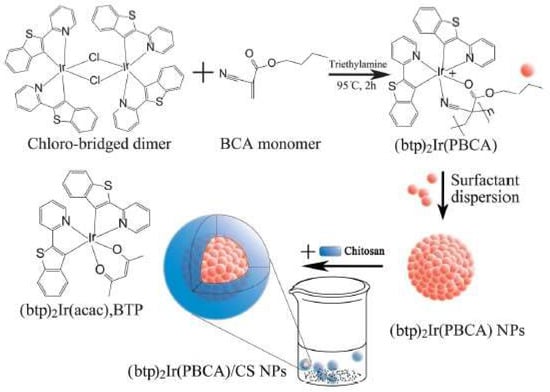 - Zeng, Y.; Zhang, S.; Jia, M.; Liu, Y.; Shang, J.; Guo, Y.; Xu, J.; Wu, D. Hypoxia-Sensitive Bis(2-(2′-Benzothienyl)Pyridinato-N,C3′)Iridium[Poly(N-Butyl Cyanoacrylate]/Chitosan Nanoparticles and their Phosphorescence Tumor Imaging in Vitro and in Vivo. Nanoscale 2013, 5, 12633–12644. [Google Scholar] [CrossRef] [PubMed]