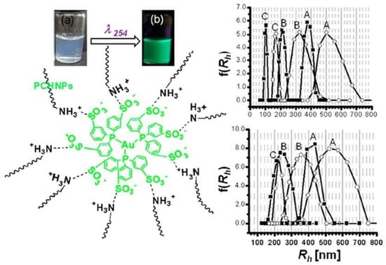 Schematic illustration for the formation of phosphorescent CS nanoparticles using Au(I) molecular system as a crosslinker. The light scattering data demonstrates the formation of size-tunable particles. Figure (a) CS nanoparticles in day light, (b) CS nanoparticles on excitation with UV lamp. A, B, C represents varying concentrations of Au(I) molecular system and CS polymer during synthesis of phosphorescent CS nanoparticles. Reprinted with permission from J. Phys. Chem. C 2015, 119, 12551–12561, Copyright 2015, American Chemical Society [].