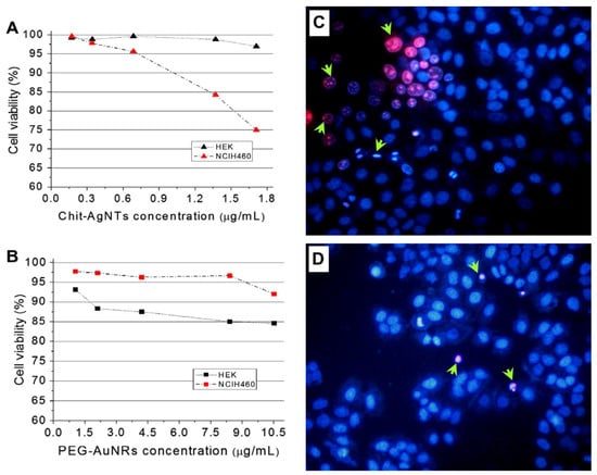 Demonstrates stabilizing feature of CS polymer during formation of CS capped silver nanotriangles. The CS-AgNTs are shown to exhibit better biocompatibility compared to PEG stabilized AuNRs. The figure shows (A,B) the cytotoxicity profiles of CS-stabilized AgNTs and PEG-AuNRs respectively towards HEK (black symbols) and NCI-H460 (red symbols) cells. NCI-H460 cells double-stained with Hoechst-viability and Propidium Iodide-mortality indicators the presence of (C) CS-AgNTs and (D) PEG-AuNRs. The arrows indicate condensed and fragmented nuclei typical of apoptotic cells. Reprinted with permission from Cancer Lett. 2011, 311, 131–140, Copyright 2011, Elsevier Ireland Ltd. [].