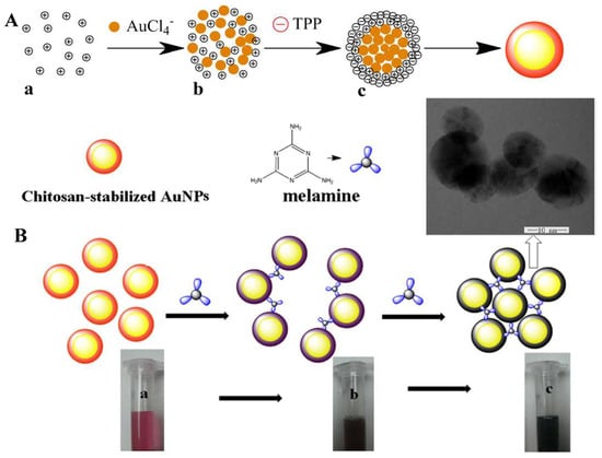 Demonstrates the sensing action of CS stabilized AuNPs. Schematics show the formation of CS stabilized AuNPs. (A) Schematic representation of the formation of chitosan-stabilized AuNPs where (a) represents the polycationic form of CS, (b) shows the formation of ion pairs with AuCl4- and (c) shows the CS stabilized AuNPs. The red circle indicates the tripolyphosphate (TPP); (B) Schematic representation of colorimetric mechanism for melamine detection. The insert is photographs of solution of tubes (a) CS stabilized AuNPs, (b) CS stabilized AuNPs with melamine, (c) CS stabilized AuNPs with melamine and TEM image of chitosan-stabilized AuNPs with melamine. The melamine detection is indicated by the color change of AuNPs. Reprinted with permission from Food Control. 2012, 32, 35–41, Copyright 2012, Elsevier [].