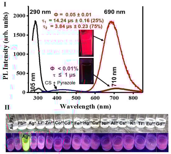 Demonstrates stabilizing feature of CS polymer. Formation of phosphorescent Au(I)-based molecular system and its heavy metal sensing application. In figure I, the difference in photoluminescence spectra of Au(I) molecular system stabilized in aqueous and chitosan media is shown. In figure II, the silver sensing ability of Au(I) molecular system stabilized in CS polymer is demonstrated from fluorescent images. (A) Changes in photoluminescence spectra of Au(I) based molecular system in the presence of various metals is shown; (B) Shows I/I0 values of various metals, derived from photoluminescence spectra. The “*” indicates weak emission from impurities in chitosan. Reprinted with permission from Anal. Chem. 2018, 90, 4999–5006, Copyright 2018, American Chemical Society [].