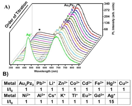 - Upadhyay, P.K.; Marpu, S.B.; Benton, E.N.; Williams, C.L.; Telang, A.; Omary, M.A. A Phosphorescent Trinuclear Gold(I) Pyrazolate Chemosensor for Silver Ion Detection and Remediation in Aqueous Media. Anal. Chem. 2018, 90, 4999–5006. [Google Scholar] [CrossRef] [PubMed]