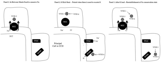 Overview of the with no Lysine Kinase (WNK) system. Abbreviations: NCC: Sodium/Chloride cotransporter; DCT: Distal Convoluted Tubule; CCD: Cortical Collecting Duct; ENaC; Epithelial Sodium Channel; ROMK: Renal Outer Medullary Potassium Channel; ⊕ Increase expression; ⨂ Decrease expression. (Panel 1) In between meals when the kidney retains Na+ and K+. This is mediated by the presence of WNK3 which increases the expression of NCC in the DCT as well as prevents ROMK expression in the CCD. (Panel 2) K+ rich meal period when there is need to excrete K+. Expression of WNK4 causes suppression of WNK3 which leads to diminished presence of NCC in the DCT and increased Na+ delivery to CCD. In the presence of aldosterone, ENaCs are expressed in the CCD with electrogenic Na absorption making the lumen negative. WNK4 increases the expression of ROMK in the CCD with the removal of K down the electrical gradient. (Panel 3) After K rich meal period. WNK1 antagonizes WNK4 with re-expression to WNK3 phenotype (Panel 1).
