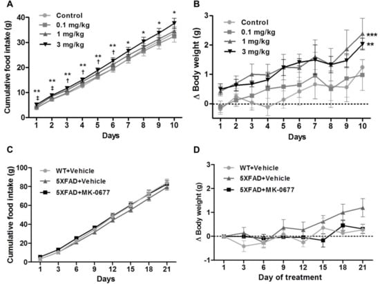 Inasmuch as 5XFAD mice exhibit detectable Aβ deposits at two months of age [,], MK-0677 (Bio-Techne Corporation, Minneapolis, MN, USA) or a vehicle was administered at the age of three months. MK-0677 was dissolved in saline and administered by intraperitoneal injections at a dose of 5 mg/kg daily for three weeks. The vehicle groups were injected with saline in parallel. The animals were sacrificed one day after the last administration. Food intake and body weight were measured before administration during the period of treatment.