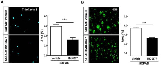 MK-0677 treatment significantly reduced Aβ plaques in the deep cortical layers of 5XFAD mice. The burden of Aβ was estimated by thoflavin-S staining and immunohistochemical staining for the 4G8 antibody. 5XFAD mice treated with MK-0677 (n = 6) showed a decreased positive area (%) in both thioflavin-S (A) and 4G8 (B)-stained brains, compared with vehicle-treated 5XFAD mice (n = 7). *** p < 0.001 indicates significant differences between the groups. Scale bar = 50 μm.