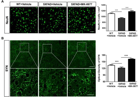 We examined whether the anti-amyloid actions of MK-0677 affected the neuronal and synaptic loss in the AD brain. To visualize neuronal death and synaptic loss induced by Aβ, we immunohistochemically stained brain tissues with neuronal nuclear antigen (NeuN) and synaptophysin (SYN) The quantitative analysis showed that the number of NeuN-positive cells and SYN immunoreactivity were significantly decreased in the neocortex of vehicle-treated 5XFAD mice compared with the vehicle-treated wild-type mice (Figure 3). In contrast, the number of NeuN-positive cells per area (Figure 3A) and optical density of SYN (Figure 3B) were significantly higher in the MK-0677-administered 5XFAD mice compared with the vehicle-injected 5XFAD mice. These results demonstrated that neuronal and synaptic loss in the brains of 5XFAD mice was ameliorated by treatment with MK-0677.