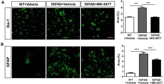 To examine the effects of MK-0677 on neuroinflammation induced by Aβ, we performed immunohistochemical staining for the microglia marker ionized calcium-binding adaptor molecule 1 (Iba-1) and astrocyte marker glial fibrillary acidic protein (GFAP). The quantitative analysis showed that the percentages of the Iba-1- and GFAP-stained areas were markedly increased in the vehicle-administered 5XFAD mice compared with the vehicle-treated wild-type littermate mice. However, the MK-0677-treated 5XFAD mice showed a significant decrease in the Iba-1-positive (Figure 4A) and GFAP-positive (Figure 4B) areas compared with those in the vehicle-treated 5XFAD mice. These results suggested that MK-0677 treatment alleviates the neuroinflammation induced by Aβ in the AD brain.