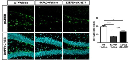 MK-0677 treatment significantly improved the reduced phosphorylation of CREB in 5XFAD mice. Immunofluorescent staining was performed to detect the phosphorylation form of CREB (pCREB) in dentate gyrus of the hippocampus of wild-type (n = 8) and 5XFAD mice. MK-0677-treated 5XFAD mice (n = 6) showed significantly increased pCREB, compared with vehicle-treated 5XFAD mice (n = 7). * p < 0.05 and *** p < 0.001 indicate significant differences between the groups. Scale bar = 50 μm. CREB = cyclic adenosine monophosphate (cAMP) response element binding protein.