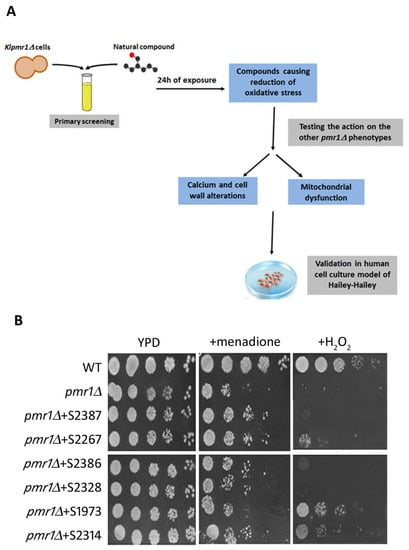 (A) General flowchart of the natural products screen approach. The primary screening is performed to identify compounds that alleviate the oxidative stress of pmr1-mutant cells. Then the effects of the positive hits are tested for the other phenotypes of the mutant strain. The final step is to test the selected molecules on the human cell cultures used as model for Hailey-Hailey disease; (B) The PMR1-deleted strain exposed or not for 24 h to different natural products was tested for its ability to grow with or without the 60 µM menadione or 4 mM H2O2. Wild type cells (WT) were used as control.