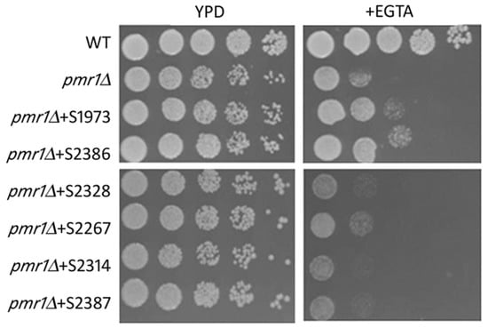 Our next goal was to assess if the hits selected in our screening were also able to rescue the multiple phenotypes associated with the deletion of the PMR1 gene. As reported by [], the deletion of the PMR1 in K. lactis cells led to a higher content of intracellular calcium as well as growth defects when the homeostasis of this ion is disrupted by EGTA. For this aim, we tested the sensitivity of the Klpmr1∆ cells treated with the selected hits to the calcium chelator EGTA. As indicated in Figure 2, only two compounds had a positive effect: S2386 and S1973, meanwhile the other four molecules were ineffective.