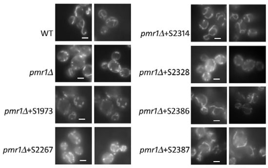 K. lactis strain deleted for PMR1 gene had defects in the cell wall organization. Indeed, as shown by using the fluorescent dye Calcofluor white (CFW), which binds the cell wall component chitin, we previously reported that in wild type cells the chitin is mainly deposited to the bud-emergence sites, whereas in the Klpmr1∆ strain the fluorescence is distributed across the entire cell wall []. To analyze the effect of the selected hits on the cell wall structure of our mutant, the CFW staining was performed. We found that all the six molecules were able to recover the wild type-like chitin distribution (Figure 3). However, the molecules S1973 and S2314 induced a recovery of 40%; meanwhile, the compounds S2267, S2387 and S2386 relieved the wall disorganization in about 50% of the cells. Particularly, the compound S2328 strongly recovered the cell wall morphology in 80% of klpmr1∆ cells.