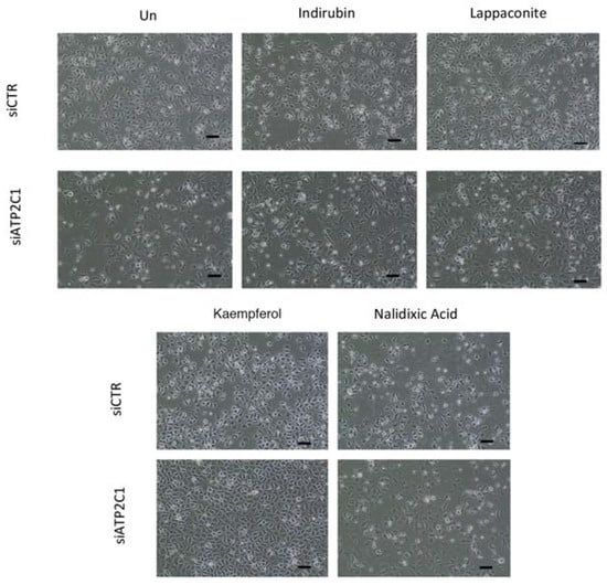 Keratinocytes-derived cell line, HaCaT, was transfected with either siRNA-CTR or siRNA-ATP2C1; 24 h post-transfection, cells were treated with the indicated compounds at 10 µM for a further 24 h and analyzed by microscopy. (100× magnification). The potencies (EC50 = 0.8 µM +/− 0.1) of Kaempferol were obtained from the dose–response curves using GraphPad Prism (GraphPad Software, La Jolla, CA, USA). Scale bar: 50 µm.