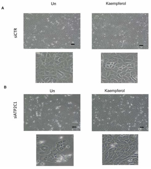 (A,B) NHKCs (primary human keratinocytes) were transfected with control (siRNA-CTR) or ATP2C1-specific siRNA oligonucleotides; 24 h later, cells were treated with Kaempferol (10 µΜ) for 24 h and analyzed by microscopy. (100× magnification). Each of the lower images is an enlarged subset of the image above. Scale bar: 50 µm.