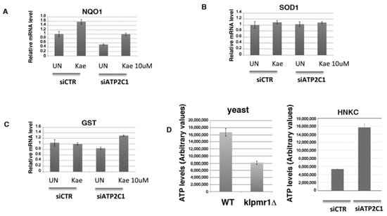 (A–C) NHKC cells were transfected with control (siRNA-CTR) or ATP2C1-specific siRNA oligonucleotides; 24 h later, cells were treated with Kaempferol (10 µΜ) for 24 h, the total RNA extracted, and the expression of the indicated targets analyzed by RT-PCR; (D) ATP production in both yeast (left) and primary human keratinocytes (right). ATP levels were analyzed in Klpmr1∆ and WT cells, and ATP production was assessed in primary human keratinocytes transfected with control (siRNA-CTR) or ATP2C1-specific siRNA oligonucleotides.