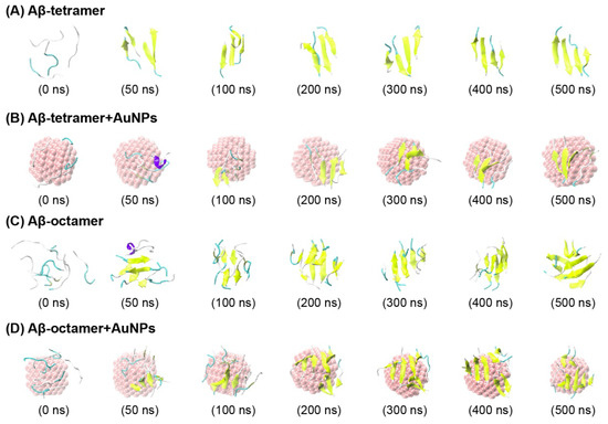 Detailed analysis of a representative molecular dynamics (MD) trajectory starting from the initial state for the Aβ-tetramer system (A), Aβ-tetramer + AuNPs system(B), Aβ-octamer system (C), and Aβ-octamer + AuNPs system (D). Snapshots at seven different time points and the top view of the snapshot generated at t = 500 ns. The peptides are represented as cartoons, with the β sheet in yellow, the coil in cyan and the other secondary structure in white and purple. The AuNPs are in van der Waals (vdW) representation in pink. For clarity, counter ions and water molecules are not shown.