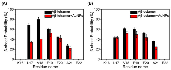 Calculated β-sheet probability of each residue of Aβ (16-22) peptides in (A) the Aβ tetramer system (red) and Aβ tetramer + AuNPs system (black) and (B) the Aβ octamer system (red) and the Aβ octamer + AuNPs system (black).