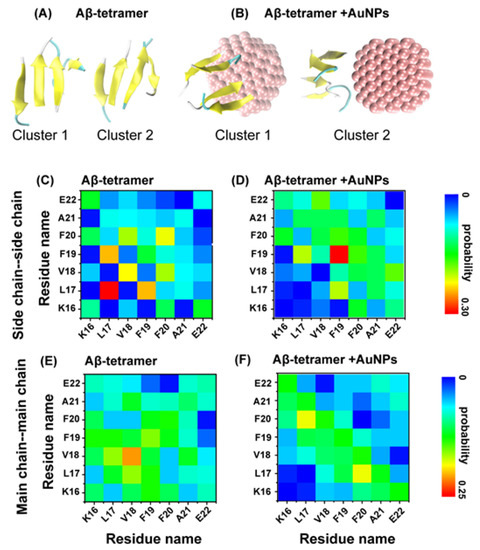 Representative conformations of the top two most-populated clusters for the Aβ tetramer in the absence (A) and presence (B) of AuNPs. Side-chain-side-chain (SC-SC) and main-chain-main-chain (MC-MC) contact probability maps for Aβ tetramer in the absence (C,E) and presence (D,F) of AuNPs. The Aβ tetramer is shown in new cartoon representation. The peptides are colored in yellow. The AuNPs are in vdW representation and colored in pink.