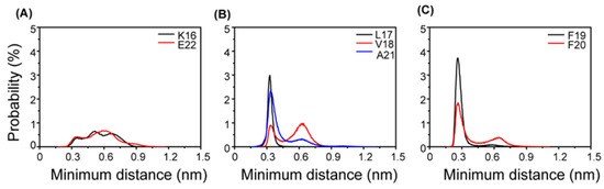 Probability distribution of the minimum distance between the side chain of each residue.and AuNPs’ surface in the Aβ tetramer/octamer + AuNPs system. The distance between AuNPs’ surface and (A) K16, E22, (B) L17, V18, A21, (C)F19, F20.