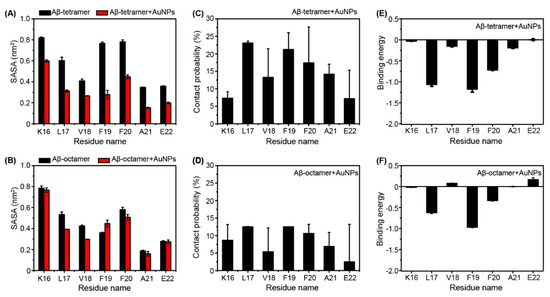 However, in Figure 5B, the SASA of the Aβ octamer has little difference between the Aβ octamer in the presence of AuNPs and in the absence of AuNPs. This indicates that AuNPs are too small to supply enough interaction surface for the Aβ octamer. Interestingly, L17 and F20 also display relatively higher interaction probabilities and lower binding energy in the Aβ octamer + AuNPs system in Figure 5E,F.