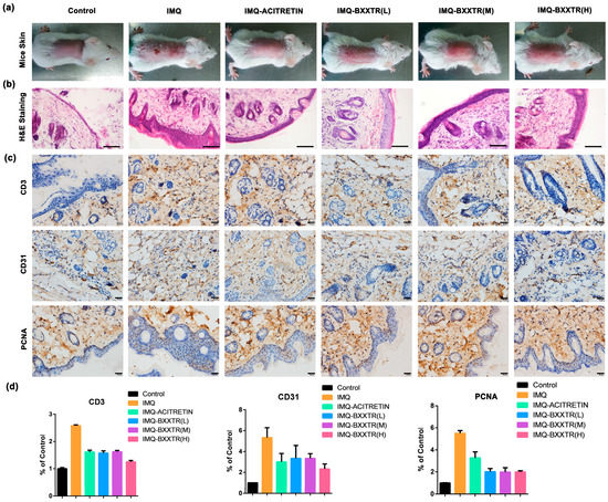 2.1. BXXTR Treatment Alleviates IMQ-Induced Psoriasis-Like Skin Inflammation in BALB/c Mice