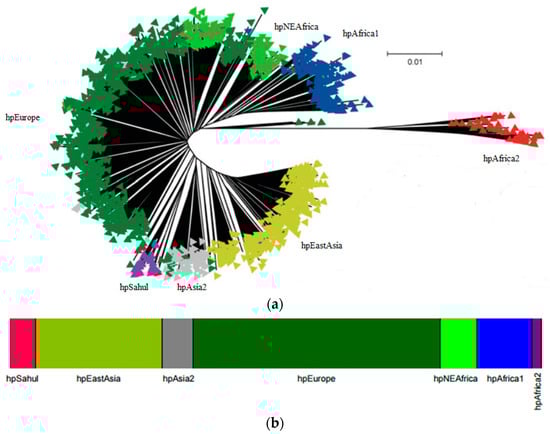 The study of seven housekeeping genes of H. pylori has been widely used to characterize the strains. The genes used for genes multilocus sequence typing (MLST) are atpA, efp, mutY, ppa, trpC, ureA and yphC [13]. The Bayesian clustering of these seven housekeeping genes applied to hundreds of strains from distinct geographic regions [2,14] revealed the presence of seven modern populations of H. pylori that clusters according to the geographic origin of the bacterium and its host (reviewed in [15,16,17]). The seven modern populations of H. pylori, hpAfrica2, hpAfrica1, hpNEAfrica, hpSahul, hpAsia2, hpEurope and hpEastAsia (Figure 1a,b), evidences that H. pylori and man co-evolved together, since they went “out of Africa” [2,3,14]. Each of these populations may be divided into subpopulations. For example hpAfrica1 is currently divided in hspSAfrica, hspWAfrica and hspCAfrica. The structured population provided strong evidence of ancient ancestry in Africa and of co-evolution with the human host since then. The original Human migration from Africa to the Middle East is estimated to have occurred ~60,000–150,000 years ago and then independently to Europe and Asia [18,19,20].