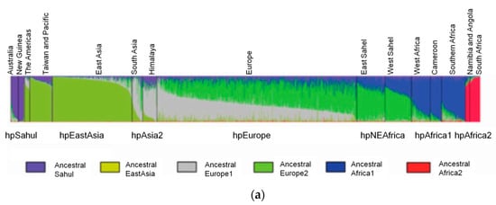 The STRUCTURE software has three model options, the “no admixture model”, the “admixture model” and the “linkage model”. The selection of the most appropriate model depends on the user’s data and study objectives. The “no admixture model” is the simplest case where each individual is assumed to have originated in a single population, whereas when there is prior knowledge about the origin of the populations under study and there is no reason to consider each population as completely discrete, the “admixture model” is appropriate. The “linkage model” is like the admixture model, but linked loci are more likely to come from the same population. The linkage model relies on linkage disequilibrium—the nonrandom association of alleles at different loci—that is a sensitive indicator of the population genetic forces that structure a genome [23]. There are currently six ancestral or precursor populations inferred to H. pylori using the linkage model of STRUCTURE (Figure 2) to analyze the seven housekeeping genes used for MLST. These are Ancestral Sahul, Ancestral EastAsia, Ancestral Europe 1 (AE1), Ancestral Europe 2 (AE2), Ancestral Africa1 and Ancestral Africa2 [2,22,28]. Modern populations were produced by admixture of ancient populations.