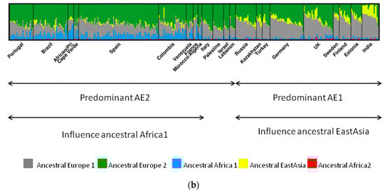 The case of hpEurope is particularly interesting, as this population is a recombinant of mainly AE1 and AE2 [2]. AE1 probably entered Europe via central or southern Asia, while AE2 entered Europe via Northeast Africa or Southern Europe [2,29]. The strains from India assigned to hpEurope revealed residual evidence of AE2, but presented a higher influence of ancestral EastAsia (Figure 2). This influence of ancestral EastAsia was still observed, even that in a small scale, for countries where AE1 is more predominant, favoring the entering of AE1 through Asia. Southern European countries presented a higher proportion of AE2 (Figure 2). Interestingly, Iberian countries also present influence of the recombination with ancestral Africa1, that is even higher than AE1 in a few hpEurope strains from African Portuguese speaking countries [29].