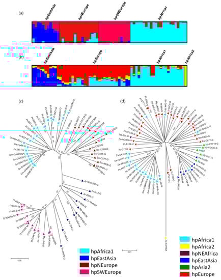 Population structure of H. pylori prophages: (a) DISTRUCT plot of Bayesian population assignments using STRUCTURE and an admixture model (K = 4) for prophages genes (PST); (b) Same methodology used for the sequences of seven housekeeping genes (MLST). Each bacterial isolate is depicted by a thin vertical line, which is divided into K colored segments representing the membership coefficients in each cluster; (c) Neighbour-joining tree (Kimura 2-parameter) of concatenated prophage sequences; (d) Neighbour-joining tree (Kimura 2-parameter) of concatenated sequences of MLST genes. In C and D the strains are colour-coded according to the population assignment by STRUCTURE using PST and MLST genes, respectively (adapted from [10]).