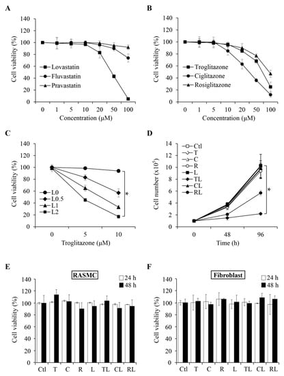 A synergistic effect in the anti-proliferation activity of troglitazone and lovastatin. (A) Concentration responses of three statin derivatives in suppressing proliferation in SW1736 cells. (B) Concentration responses of three thiazolidinediones (TZDs) derivatives in SW1736 cells. (C) Monitoring the anti-proliferation effect of troglitazone in combination with lovastatin. Cells were treated with troglitazone (5 and 10 μM) in combination with lovastatin (labeled L, 0.5, 1, and 2 μM). (D) Monitoring the proliferation rates in SW1736 cells treated with different combinations of indicated drugs. Concentrations used were defined previously. Single agents (T, C, R, and L): 10 μM except L (2 μM). Combination (TL, CL, and RL): TZDs (10 μM) plus L (2 μM). Cells were treated for 48 h and 96 h, and then analyzed by trypan blue staining. (E,F) Lack of anti-proliferation effect in normal RASMC (E) and human gingival fibroblast cells (F). Cells were treated with indicated drugs as used in (D) for 24 and 48 h. Proliferation was analyzed by 3-(4,5-Dimethylthiazol-2-yl)-2,5-diphenyltetrazolium bromide (MTT) assay. Values represent the means ± S.E.M. (n = 3). * p < 0.05. C: ciglitazone; CL: combination of ciglitazone and lovastatin; Ctl: control; L: lovastatin; R: rosiglitazone; RL: combination of rosiglitazone and lovastatin; T: troglitazone; TL: combination of troglitazone and lovastatin.