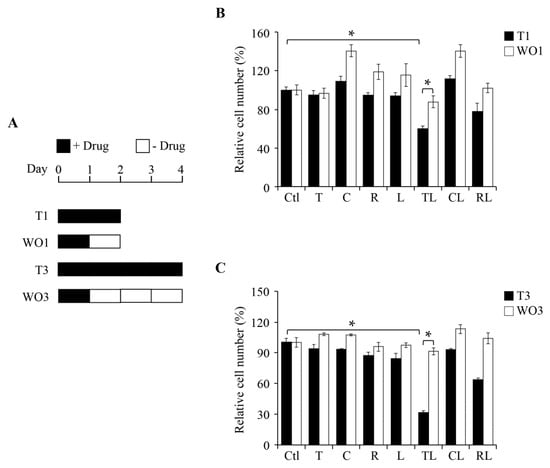 Reversible feature of the anti-proliferation effect following drug-removal. (A) The experimental procedures for treatment and drug-removal. Cells were treated with the indicated drugs for 1 day, followed by washout with fresh medium and incubation for an additional 1 (WO1) or 3 (WO3) day(s). (B,C) Proliferation assay in cells with or without drug-removal for 1 day (B) or 3 days (C). The drug concentration used is the same as that in Figure 1D. The relative cell number was estimated by MTT assay. Values represent the means ± S.E.M. (n = 3). * p < 0.05. C: ciglitazone; CL: combination of ciglitazone and lovastatin; Ctl: control; L: lovastatin; R: rosiglitazone; RL: combination of rosiglitazone and lovastatin; T: troglitazone; TL: combination of troglitazone and lovastatin.