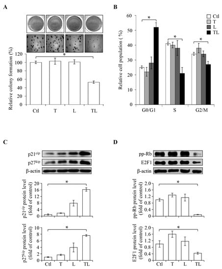 Combination treatment of troglitazone and lovastatin inhibits cell cycle progression. (A) Combination treatment of troglitazone (T) and lovastatin (L) restrained the anchorage-independent growth of SW1736 cells in semi-solid agar. Cells were treated with the indicated drugs for 14 days and then the relative cell colony formation was assayed. Cell colonies were fixed and then stained by crystal violet (magnification ×40). (B) The combination treatment increased the relative ratio of cell populations accumulating at the G0/G1 phase. Cells were treated with the indicated drugs for 24 h and then the DNA content was analyzed by flow-cytometry. (C,D) Combination treatment induced the protein expression levels of p21cip and p27kip (C) and inhibited the hyperphosphorylated (pp)-Rb and E2F1 (D). Upper panels: immunoblotting images. Lower panels: quantification of immunoblotting. Cells were treated with the indicated drugs for 24 h and analyzed by immunoblotting. Values represent the means ± S.E.M. (n = 3). * p < 0.05. Ctl: control; L: lovastatin; (2 μM) T: troglitazone (10 μM); TL: combination of troglitazone and lovastatin.