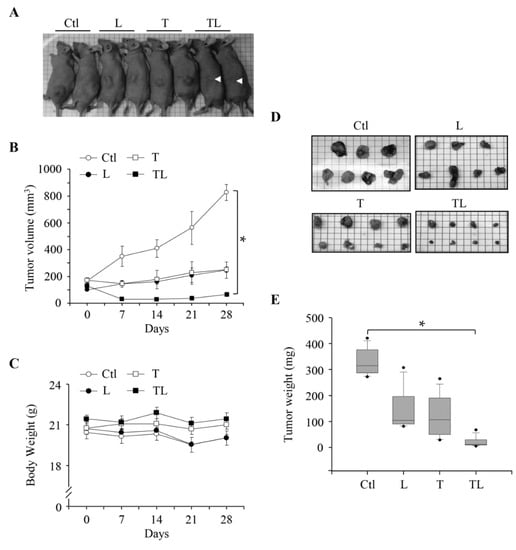 Since the combination of troglitazone and lovastatin at their sub-lethal concentrations can exhibit cell-specific anti-proliferation activities, we next examined whether this combination could also suppress tumor growth in vivo. First, the SW1736 cell line was subcutaneously inoculated in nude mice, allowing a tumor to reach a certain range of size (~200 mm3). Then, the tumor-bearing mice were randomly divided into four groups: the control (injection with phosphate-buffered saline (PBS)), troglitazone (labeled T), lovastatin (labeled L), and combination (TL) treatments. Compared to single-agent treatment (T and L), which prevented the tumor growth and maintained the initial size, the combination efficiently suppressed the progression and caused tumor regression (Figure 4A,B). Notably, body weights of mice at each group did not alter during the 28-day experimental period, suggesting no toxic side effect on normal tissues (Figure 4C). Furthermore, the combination approach markedly suppressed tumor growth in the xenograft model by monitoring tumor volume and weight (Figure 4D,E). These findings demonstrated that the combination of both drugs exhibits an effective anti-tumor effect in vivo.