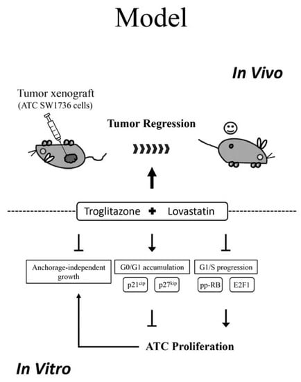 A great deal of advances in genomic analysis and immunotherapy have been made in past decades. However, therapies against ATC have not been improved []. One approach to accelerate the discovery is by drug repositioning []. In this study, we explored the therapeutic effects by a combination of troglitazone and lovastatin. Both drugs have biochemically defined targets, lovastatin for HMGCR and troglitazone for PPARγ, and exhibit anti-tumor effects when combined in a sub-lethal concentration (Figure 1 and Figure 4). We also showed that the combination can suppress signaling responsible for the G1/S progression (pp-RB and E2F1) and induce the expression of p21cip and p27kip (Figure 3). Based on these findings, we propose that the mechanism underlying the combination of troglitazone and lovastatin-induced anti-tumor effect is possibly due to the disruption of G1/S progression and cell cycle arrest at the G0/G1 phase (Figure 5).