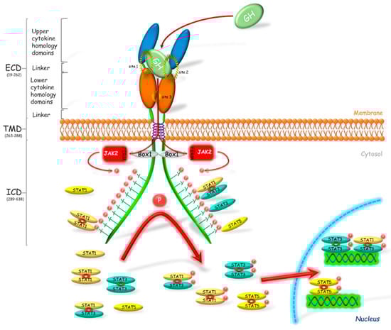 - Brooks, A.J.; Wooh, J.W.; Tunny, K.A.; Waters, M.J. Growth hormone receptor; mechanism of action. Int. J. Biochem. Cell Biol. 2008, 40, 1984–1989. [Google Scholar] [CrossRef] [PubMed]