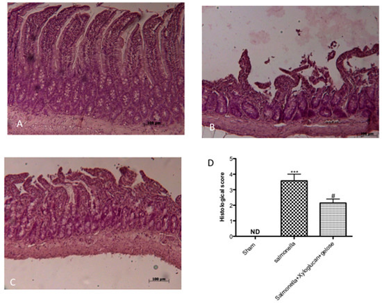 (A) The sham group; (B) Histological examination of intestine showed transmural necrosis, edema, and leukocyte infiltration in the submucosa of intestine following S. enterica inoculation compared to sham group; (C) Xyloglucan + gelose treatments significantly reduced the degree of tissue injury; and (D) The histological score. Values are means ± SEM of 10 animals for each group. *** p < 0.001 vs. Sham, # p < 0.05 vs. S. enterica.