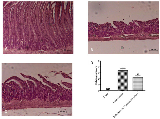 (A) The sham group; (B) Intestine from E. hirae inoculated rats showed transmural necrosis, edema, and leukocyte infiltration in the submucosa of tissue compared to the sham group; (C) Xyloglucan + gelose treatments appreciably reduced the degree of tissue injury; and (D) The histological score. Values are means ± SEM of 10 animals for each group. *** p < 0.001 vs. Sham, # p < 0.05 vs. E. hirae.