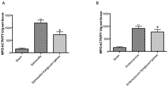 (A) MPO activity in intestine homogenates was significantly elevated from S. enterica inoculated rats. A significant decreasing in MPO activity was observed in intestine from rats treated with xyloglucan + gelose (10 mg/kg + 5 mg/kg); and (B) The same situation was observed for E. hirae inoculated rats. Pictures were captured at 10× magnification. Figures are representative of at least three separate experiments. Values are means ± SEM of 10 animals for each group. (A) ** p < 0.01 vs. Sham, # p < 0.05 vs. S. enterica. (B) ** p < 0.01 vs. Sham and # p < 0.05 vs. E. hirae.