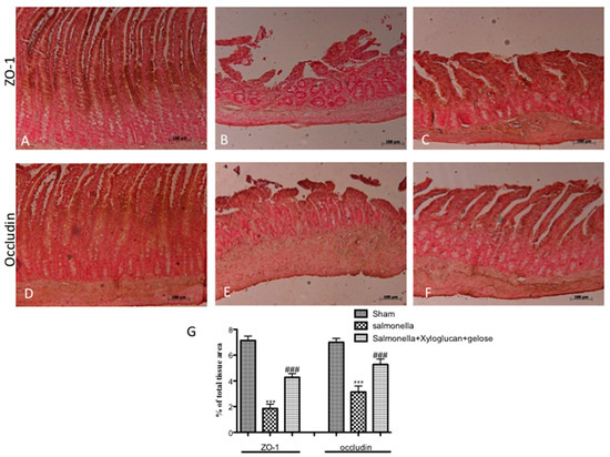 Immunostaining for ZO-1 and occludin expression in sham mice ((A) and (D) respectively); positive staining for ZO-1 and occludin following S. enterica infection ((B) and (E) respectively) and mice treated with xyloglucan + gelose ((C) and (F) respectively). (G) Densitometric analysis. Data are representative of at least three separate experiments. Images are representative of all animals in each group. Pictures were captured at 10× magnification (scale bar = 100 μm). Figures are representative of at least three separate experiments. Values are means ± SEM of 10 animals for each group. (ZO-1). *** p < 0.01 vs. Sham, ### p < 0.001 vs. S. enterica; (occludin) *** p < 0.001 vs. Sham and ### p < 0.001 vs. S. enterica.