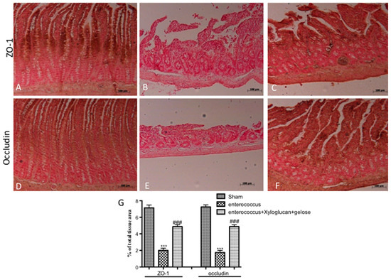 Immunostaining for ZO-1 and occludin expression in sham mice ((A) and (D) respectively). Positive staining for ZO-1 and occludin following E. hirae infection ((B) and (E) respectively) and mice treated with xyloglucan + gelose ((C) and (F) respectively). (G) Densitometric analysis. Data are representative of at least three separate experiments. Images are representative of all animals in each group. Pictures were captured at 10× magnification (scale bar = 100 μm). Values are means ± SEM of 10 animals for each group. Figures are representative of at least three separate experiments. (ZO-1) *** p < 0.01 vs. Sham, ### p < 0.001 vs. E. hirae; (occludin) *** p < 0.001 vs. Sham and ### p < 0.001 vs. E. hirae.