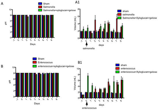 Urinary pH values were recorded every day for eight days. Our data showed that the pretreatment with xyloglucan + gelose did not significantly modify pH values compared to bacterial infection (Figure 6A,B). Moreover, urine volume was significantly increased following treatment with xyloglucan + gelose (10 mg/kg + 5 mg/kg) at 3 days after S. enterica (3.25 vs. 1.85) and 2 days after E. hirae inoculation (4.23 vs. 1.83) (Figure 6A1,B1).
