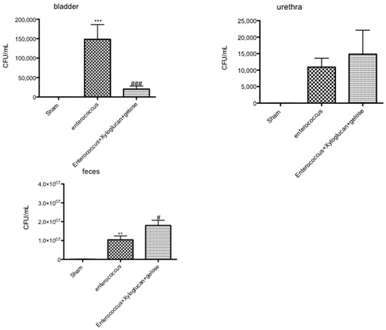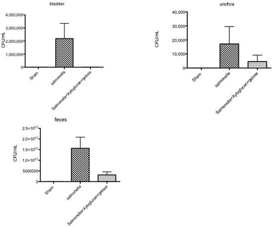 During foodborne S. enterica and E. hirae infection, pathogens can pass the gut epithelial cell lining and translocate to extra-intestinal organs like the spleen, liver, and bladder [3]. Moreover, it has been shown that both bacteria are models of UTIs related to gastrointestinal infections and other physiological disorders [3,6,7,11,12]. Therefore, our attention was focused on the effect of xyloglucan plus gelose following salmonella and enterococcus oral infection in the bladder.
