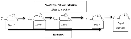 The induction of GE and UTI was made by two different infections by using S. enterica serovar Enteritidis (clinical isolate, phage type 4 according to international standards; B1241 culture of NIZO Food Research, Ede, The Netherlands) (2 × 109 CFU/mL) and E. hirae Farrow and Collins (ATCC® 8043™) (3 × 108 CFU/mL) for 3 days (day 0, day 3, and day 6). The infections were induced by gavage administration. Two days before the bacterial administration, preventive oral treatments were performed by gavage every day until the seventh day [10,38,39] (Figure 9).