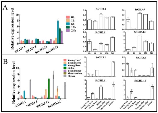 2.5. Expression Analysis of StGH3 Group I Genes