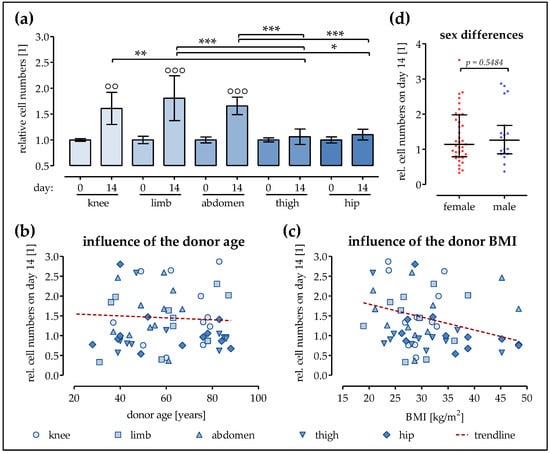 The proliferation of mesenchymal stem/stromal cells from adipose tissue (Ad-MSCs) varies depending on the donor site. Ad-MSCs derived from adipose tissue of the knee (N = 12), limb (N = 11), abdomen (N = 11), thigh (N = 12), and hip (N = 12) were osteogenically differentiated for 14 days. (a) To determine cell proliferation, the total protein content was determined by Sulforhodamine B (SRB) staining on days 0 and 14 of differentiation; (b) Relative cell numbers on day 14 of differentiation as a function of the donor age; (c) Relative cell numbers on day 14 of differentiation as a function of the donor body mass index (BMI); (d) Comparison of the relative cell numbers of differentiated (day 14) Ad-MSCs from male and female donors; °° p < 0.01 and °°° p < 0.001 when comparing day 0 with day 14 within each group; * p < 0.05, ** p < 0.01, and *** p < 0.001 as indicated.